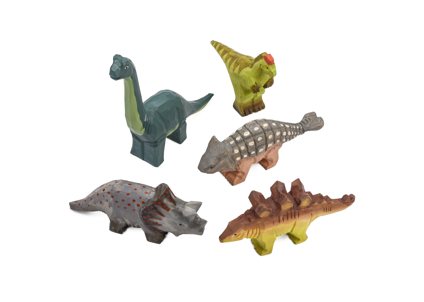 This pack contains 5 colourful dinosaurs including favourites like: Diplodocus (14.5 x 3.5 x 13.6 cm), Stegosaurus (13 x 2.4 x 6 cm), Triceratops (12.6 x 2.6 x 6.1 cm), Oviraptor (10.5 x 3 x 9.5 cm) and an Ankylosaurus (13.5 x 3 x 5cm). The set introduces dinosaurs to children and is ideal for discussions and role play on topics such as “Prehistoric Animals”; “What did they feed on”; or “Why are Dinosaurs extinct”. They are hand carved from Basswood and hand painted. They are long lasting and sturdy.