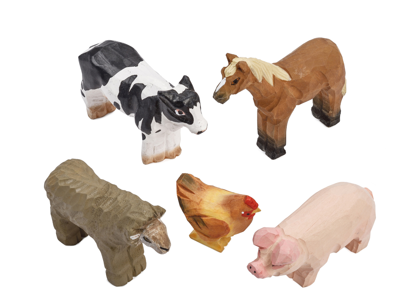 This selection of familiar farmyard animals provides a great introduction to farming and favourite farm animals. Children will be able to learn about the sounds they make; what they like to eat and how they live. The set contains a Black & White Cow (9.5 x 2.7 x 6.3 cm), a Brown Horse (10.8 x 3 x 9 cm), a Pig (9.1 x 3.1 x 5.5 cm), a Sheep (7.5 x 3 x 7 cm) and a Chicken (5 x 2.5 x 4.5 cm). The figures are hand carved from Basswood and then painted by hand.