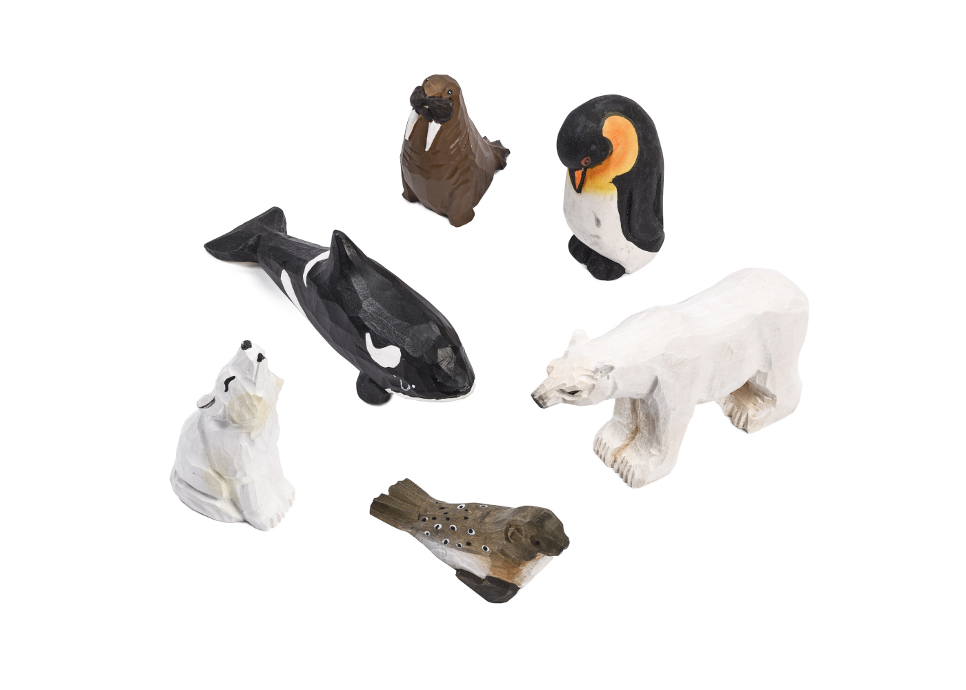 This pack contains 6 hand carved and hand decorated Polar animals; Arctic Wolf (4.7 x 3 x 8.5 cm), Orca Whale (13.5 x 3.5 x 7 cm), Penguin (3.2 x 4 x 8.2 cm), Polar Bear (11.3 x 3.5 x 6.5 cm), Harbour Seal (8 x 2.9 x 3.8 cm) and a Walrus (6.5 x 3.4 x 6.8 cm). Each animal is unique and is built to last. Ideal for discussions and role play on the topic of polar animals or living in a polar environment. Encourages communication, comparing and group interaction. Sets the scene for story-telling and imaginative play.